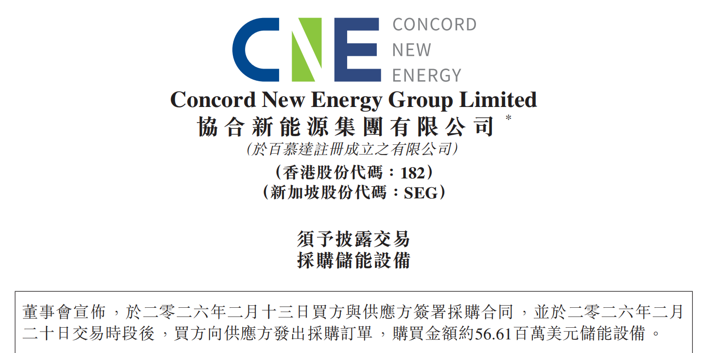 协合新能源(00182.HK)2月20日公告,全资附属公司Blue Heron Solar, LLC(一家美国特拉华州有限责任公司)近日签约了Trina Storage(天合光能),以总采购价约5661万美元(包括4322万美元采购价,1339万美元关税),购置储能设备(包括储能电池、相关部件及测试、调试、交付及保修,含5年储能设备保修服务),用于美国开发的146MW/292MWh储能项目(折合单价约0.1939美元/Wh,约1.34元/Wh),将于2026年8月31日前交付。
