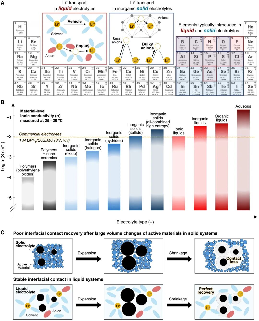 本研究通过对比液态与固态电解质的离子传输机制,揭示固态电解质需依赖重原子(如S2-、Ge4+)维持结构稳定性,导致其密度显著高于液态体系。例如,典型硫化物固态电解质的密度高达1.8-2.1 g/cm3,而液态电解质仅1.2-1.3 g/cm3,直接削弱电池的质量能量密度。此外,固态电解质在材料级别的离子电导率(10-4–10-2 S/cm)仍低于高性能液态电解质(如1.3 mol/L LiFSI/氟代乙腈,可达10-2 S/cm),且其测量常依赖不切实际的高压条件(>10 MPa),与实际电池运行环境脱节。