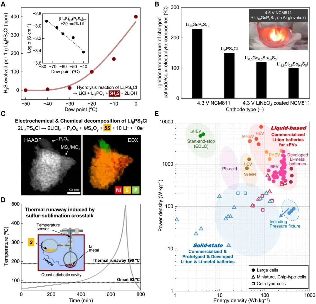 研究通过实验证明,硫化物固态电解质遇湿气会释放剧毒H2S气体(≥1000 ppm可致命),且其与富镍正极材料(如NCM811)接触后,在100°C以下即可引发自燃。此外,固态体系中锂枝晶更易沿晶界生长,触发短路和热失控。对比液态电池(可通过隔膜与界面自修复抑制枝晶),固态系统的安全优势被过度夸大。图中Ragone曲线进一步显示,目前全固态电池的实际能量/功率密度均落后于液态体系,且数据多来自微尺度电芯,难以反映大尺寸性能。