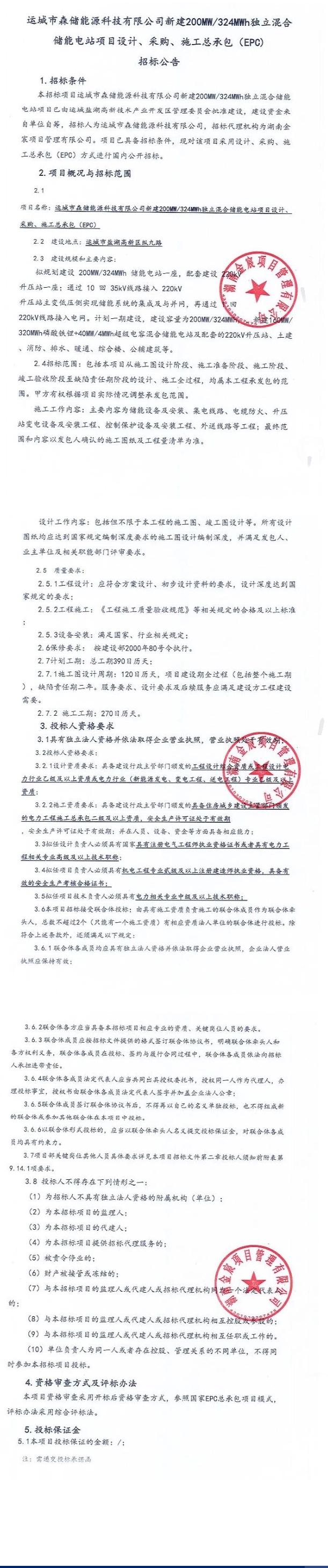 2026年2月13日,运城市森储能源科技有限公司发布山西省新建200MW/324MWh独立混合储能电站项目EPC招标公告,项目建设地点为山西省运城市盐湖高新区纵九路。配套建设220KV升压站一座,通过10回35kV线路接入220kV升压站主变低压侧实现储能系统的集成及与并网,再通过1回220kV线路接入电网。本项目招标接受联合体投标,须满足相关条件。