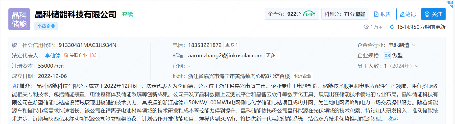 晶科储能成立于2022年12月,经营范围涵盖储能技术服务、新兴能源技术研发、工业自动控制系统装置制造及销售等,业务覆盖储能全产业链相关环节。