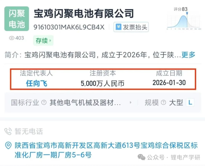 近日,宝鸡闪聚电池有限公司(简称“宝鸡闪聚电池”)正式成立,是一家由浙江吉利汽车零部件产业有限公司100%持有的企业。