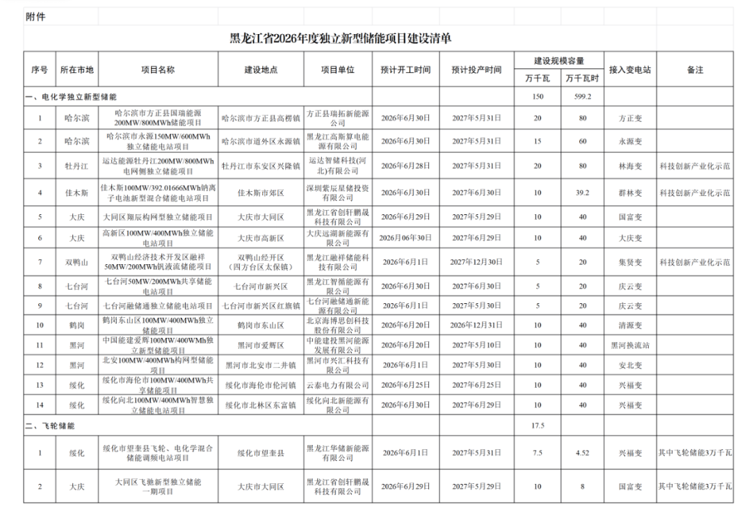 2026年2月12日,黑龙江省发展和改革委员会印发《黑龙江省2026年独立新型储能项目建设清单》,标志着该省新型储能产业迈入规模化、规范化发展新阶段。