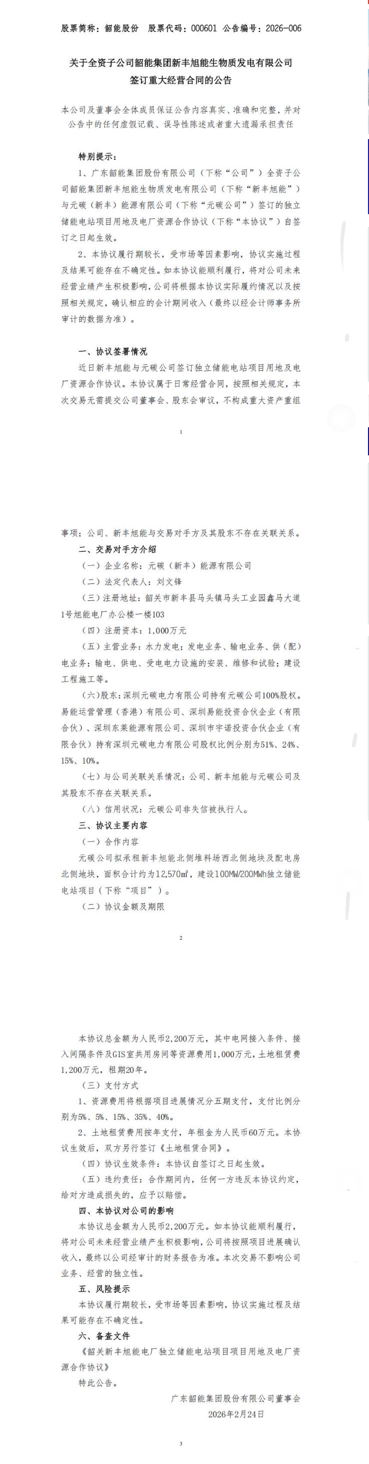 公告显示,韶能股份全资子公司韶能集团新丰旭能生物质发电有限公司(下称“新丰旭能”)与元碳(新丰)能源有限公司(下称“元碳公司”)签订的独立储能电站项目用地及电厂资源合作协议自签订之日起生效。