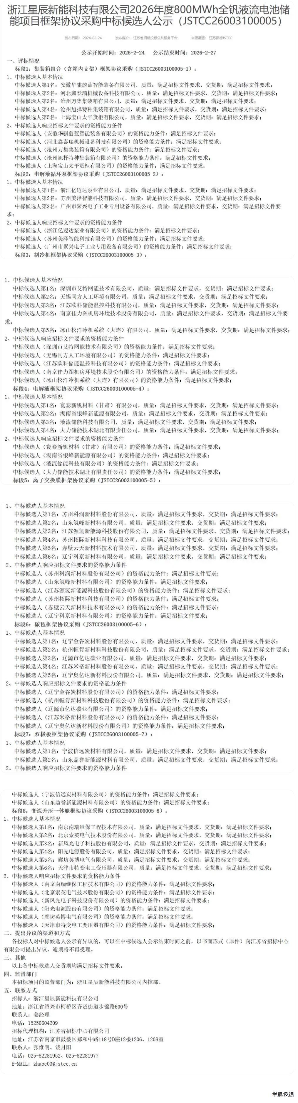 碳索储能网获悉,2月24日,星辰新能2026年度800MWh全钒液流电池储能框采中标候选人公示。