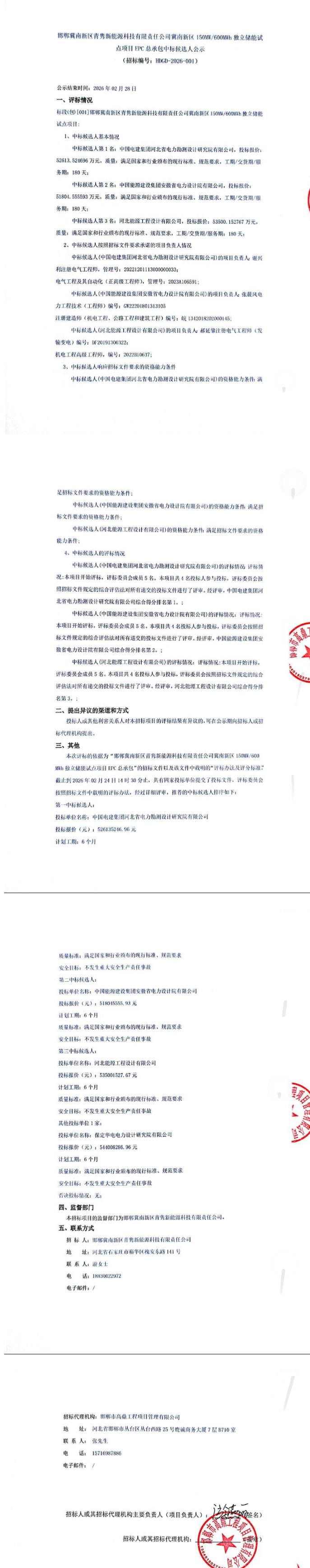 2月25日,邯郸冀南新区青隽新能源科技有限责任公司冀南新区150MW/600MWh独立储能试点项目EPC总承包中标候选人公示。第一中标候选人为中国电建集团河北省电力勘测设计研究院有限公司,投标报价52613.524696万元,折合单价0.8769元/Wh;第二中标候选人为中国能源建设集团安徽省电力设计院有限公司,投标报价51804.555593万元,折合单价0.8634元/Wh;第三中标候选人为河北能源工程设计有限公司,投标报价53500.152767万元,折合单价0.8917元/Wh。总配置容量为150MW/600MWh,采用220kV接入电网。