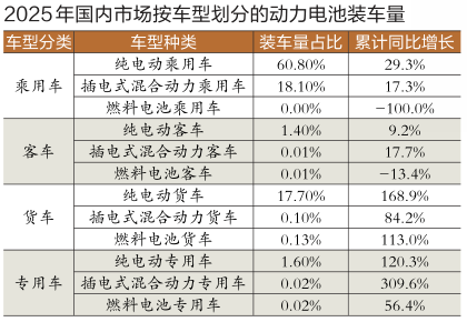 从动力电池车型配套情况来看,2025年,纯电动汽车装车量占比81.6%,插电式混合动力汽车装车量占比18.3%,燃料电池汽车占比仅0.16%。其中,货车和专用车增速较快。