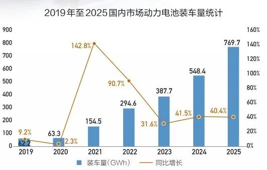 近日,中国汽车动力电池产业创新联盟(以下简称“电池联盟)”发布数据,2025年,我国动力电池装车量达到769.7GWh,同比增长40.4%。其中,磷酸铁锂电池持续领跑市场,行业集中度在高位趋于稳定,“出海”步伐进一步加快,且动力电池与储能电池双赛道并行格局愈发清晰。