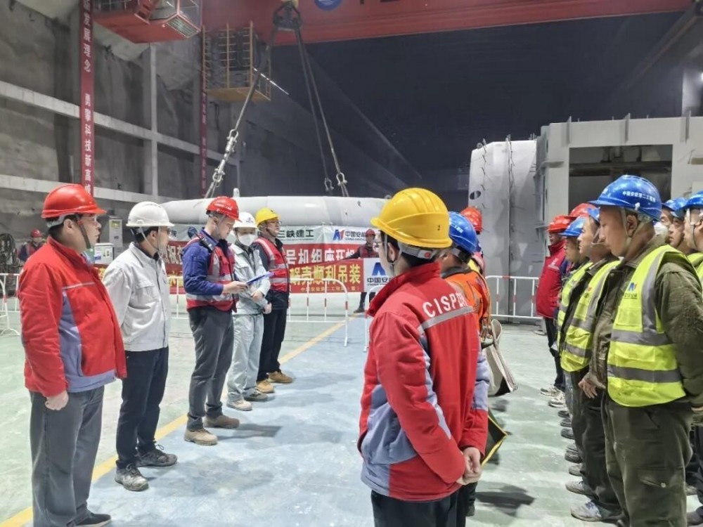 吊装作业前,工作组严格落实管控标准,联合各参建单位对300t桥机安全制动系统、机械传动部件、电气操作系统开展全维度排查检修,并提前完成试吊调试,确保起重设备状态优良。同时,结合现场实际组织专项安全技术交底,重点梳理起吊平移、精准对位、落位固定等关键环节风险要点,明确各岗位职责、协同流程及应急处置措施,确保全体作业人员规范操作、精准执行。
