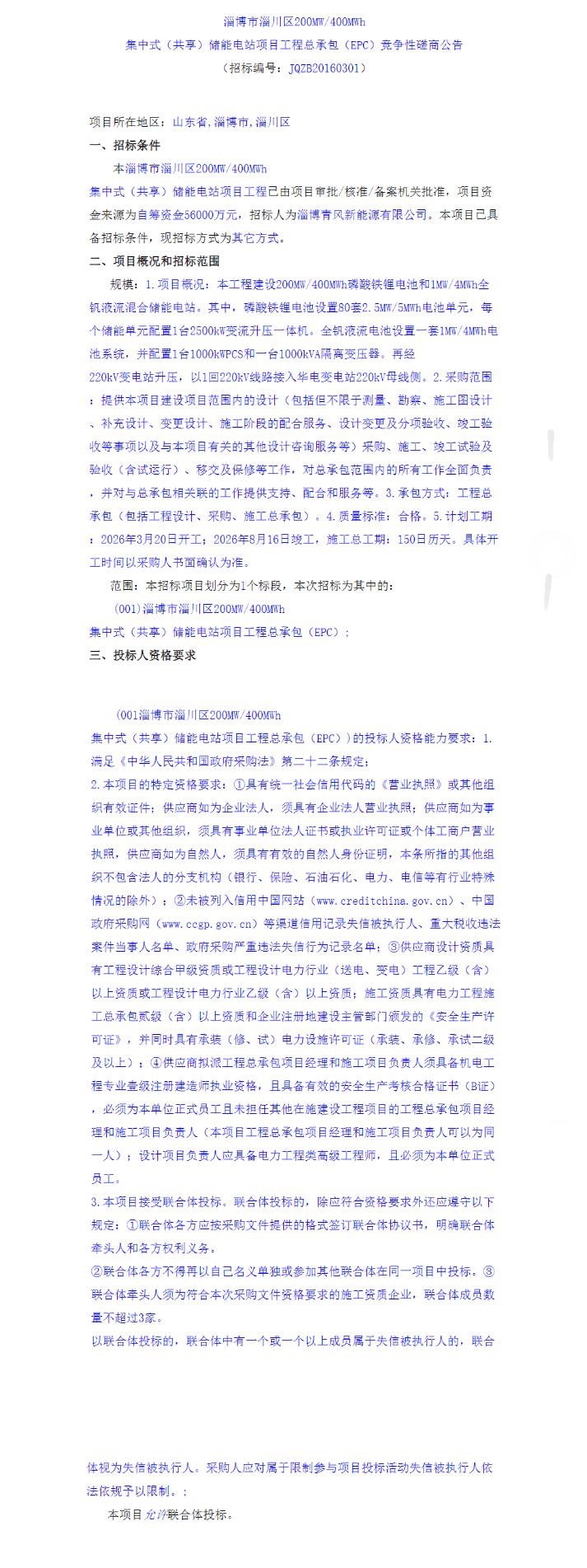 2026月3月1日,山东淄博市淄川区200MW/400MWh集中式(共享)储能电站项目工程总承包(EPC)发布招标公告,项目资金来源为自筹资金56000万元,合单价1.4元/Wh。招标人为淄博青风新能源有限公司。