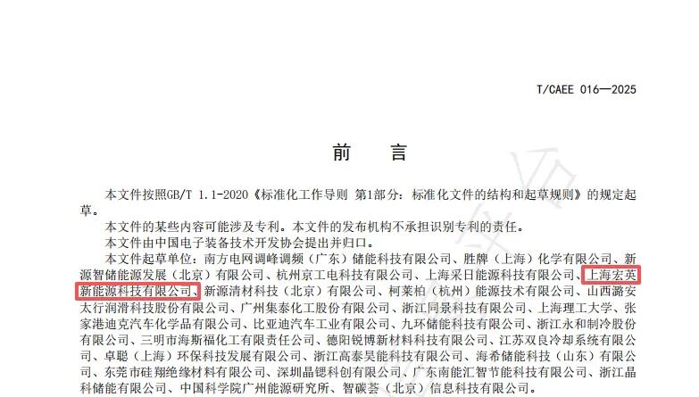 由中国电子装备技术开发协会归口管理的《储能用锂离子电池浸没式液冷系统技术规范》团体标准(标准编号:T/CAEE016-2025),已于2026年1月1日起全面实施。宏英新能源作为核心起草单位之一,与南方电网、中科院广州能源研究所、上海理工大学等30余家行业领先机构共同参与了该标准的编制工作,以创新技术和实际应用推动行业迈向高质量发展新阶段。