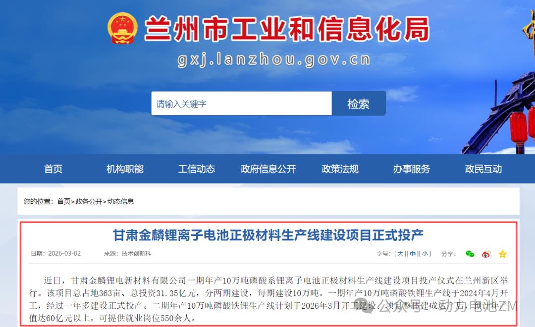 3月2日,来自兰州工信局的信息显示,近日,甘肃金麟锂电新材料有限公司一期年产10万吨磷酸系锂离子电池正极材料生产线建设项目投产仪式在兰州新区举行。