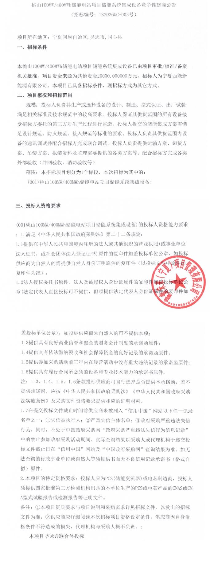 2026年3月4日,宁夏桃山100MW/400MWh储能电站项目储能系统集成设备竞争性磋商公告,采购一批储能系统设备。项目资金来源为其他资金20000万元,合单价0.5元/Wh。是该项目启动的第二次招标。要求投标人近3年须至少具有1个单体100MWh及以上集成设备项目供货业绩。不允许联合体投标。3月4日,该项目发布公告,因投标人不足三家,项目废标。