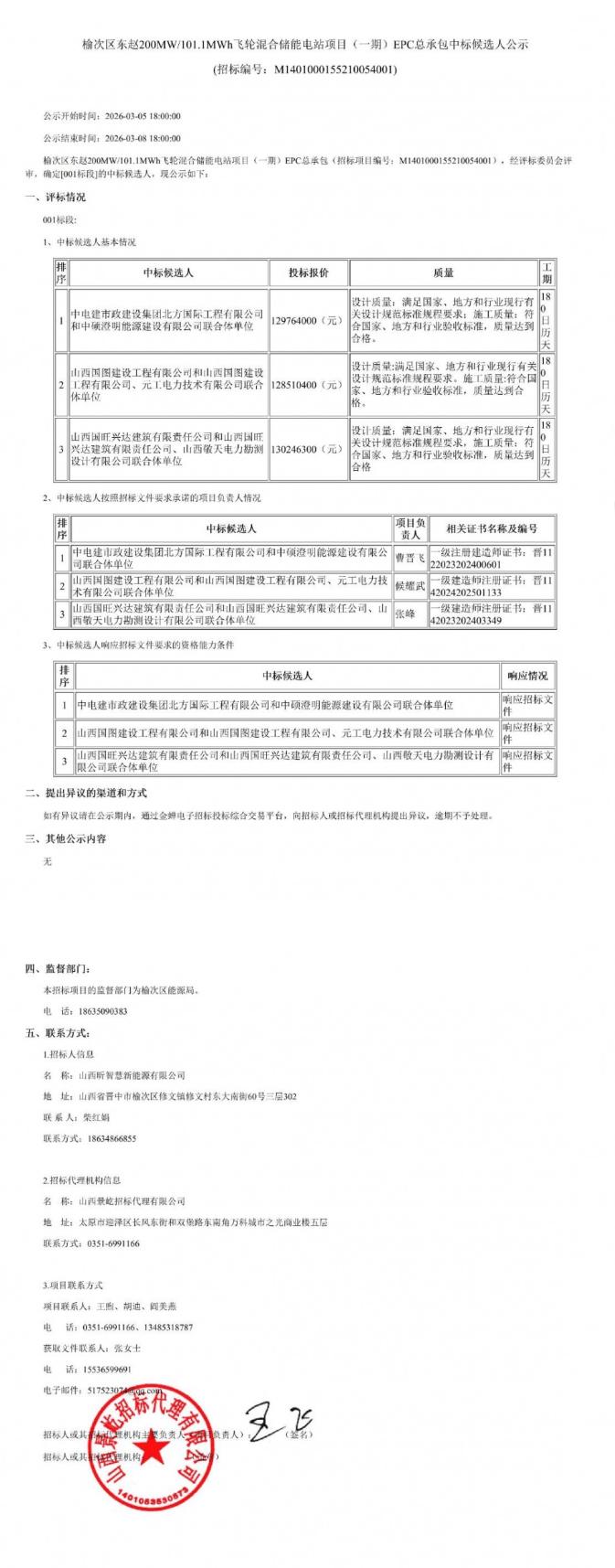 第一中标候选人为中电建市政建设集团北方国际工程有限公司和中硕澄明能源建设有限公司联合体单位,投标报价为129764000元;第二中标候选人为山西国图建设工程有限公司和山西国图建设工程有限公司、元工电力技术有限公司联合体单位,投标报价为128510400元;第三中标候选人为山西国旺兴达建筑有限责任公司和山西国旺。兴达建筑有限责任公司、山西敬天电力勘测设计有限公司联合体单位,投标报价为130246300元。