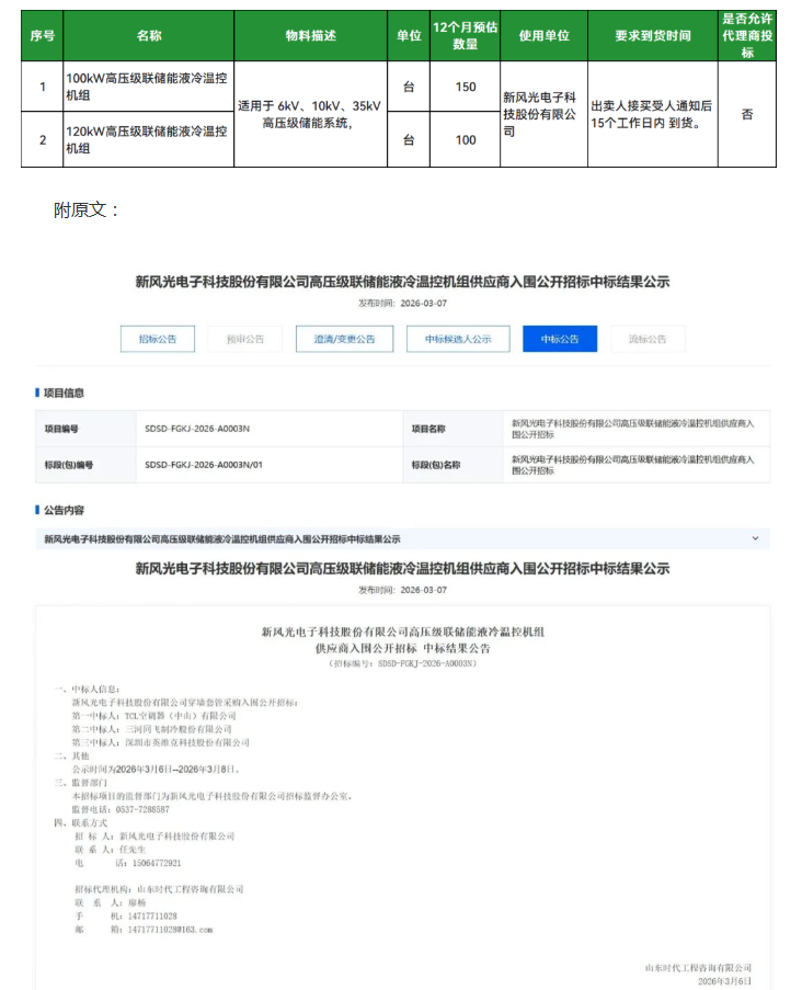 3月7日,新风光电子科技股份有限公司高压级联储能液冷温控机组供应商入围公开招标中标结果公示,第一中标人是TCL空调器(中山)有限公司;第二中标人是三河同飞制冷股份有限公司;第三中标人是深圳市英维克科技股份有限公司。