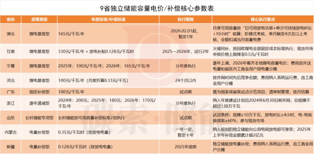 结合最新落地政策,9省的容量电价机制可分为煤电基准型、电量补偿型、长时储能专项型三类,核心参数如下表(截至2026年3月10日):