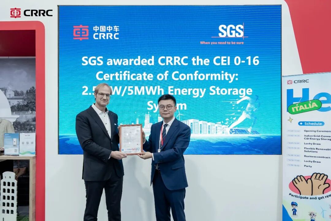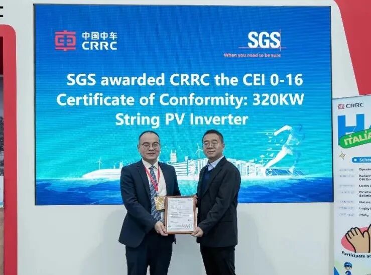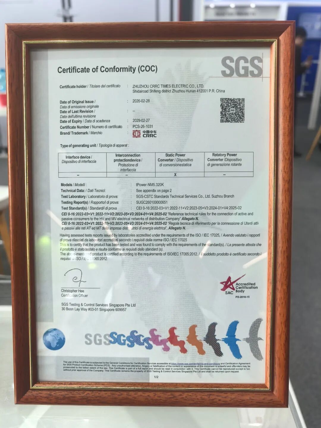 展会现场,国际认证机构SGS向公司颁发意大利CEI 0-16并网符合性证书。该认证确认了中车株洲所储能系统与光伏逆变器在技术安全、系统稳定及并网适配性等方面满足意大利并网标准,为中车株洲所进一步拓展意大利及欧洲市场提供了重要支撑。