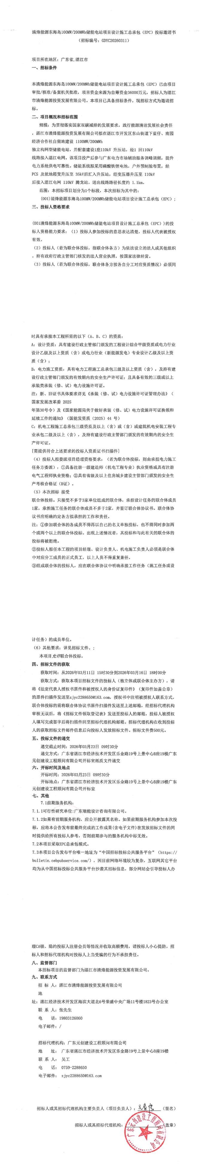 3月11日,清烽能源东海岛100MW/200MWh储能电站项目设计施工总承包(EPC)投标公告发布。