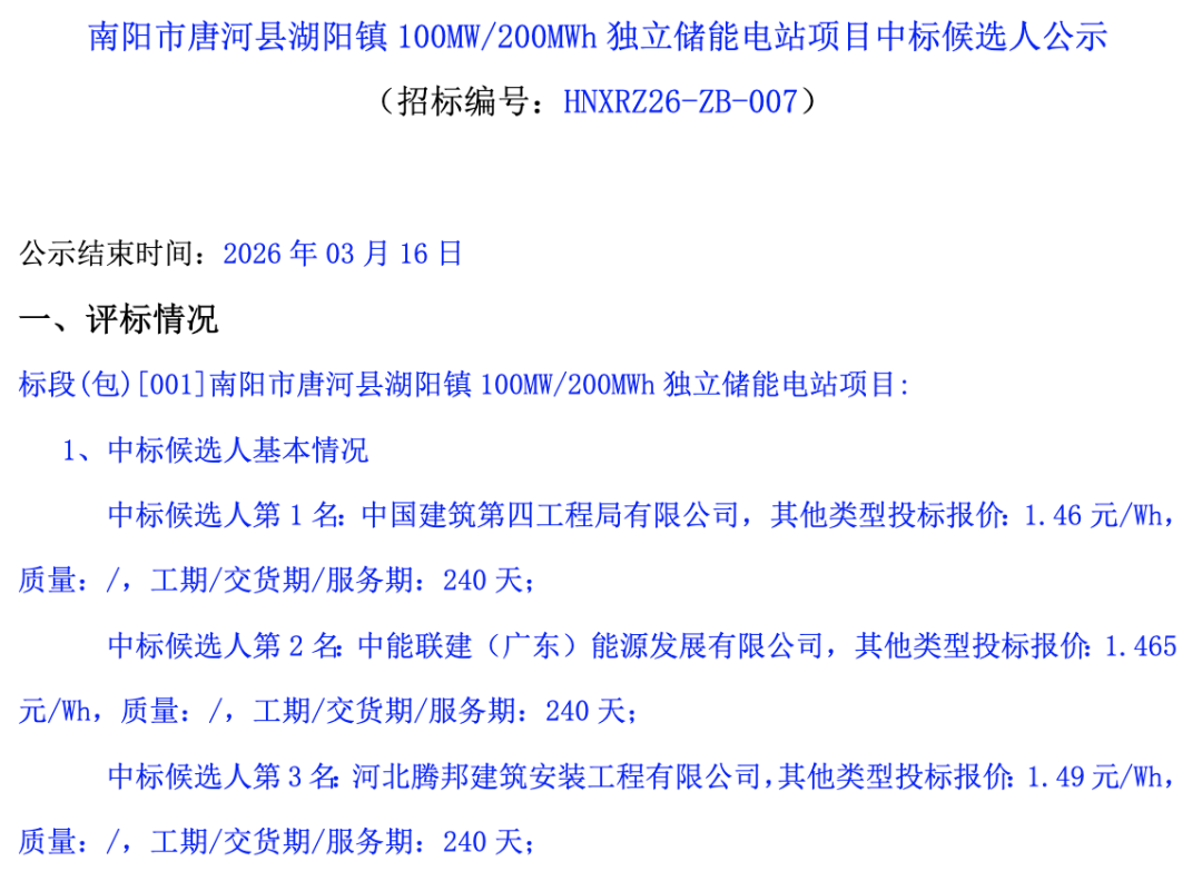 2026年3月13日,河南省南阳市唐河县湖阳镇100MW/200MWh独立储能电站项目中标候选人公示。中建四局、中能联建等三家入围的中标候选人,投标报价约1.460-1.490元/Wh。