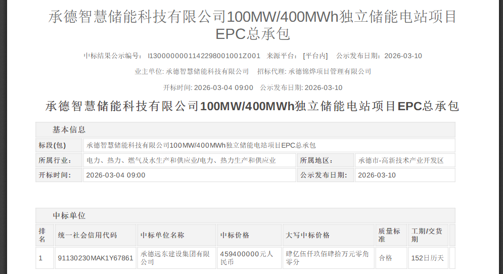 中标人为承德远东建设集团有限公司,中标金额459400000元,折合单价约1.15元/Wh。