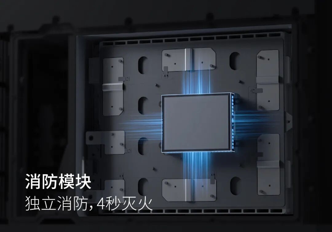 作为系统安全的最后一道防线,每个电池包还内置独立主动消防模块。模块采用热气溶胶灭火剂,当检测到极端温度时,可在最快约4秒内完成灭火动作,迅速抑制氧化反应,将潜在火灾消灭在最初阶段。