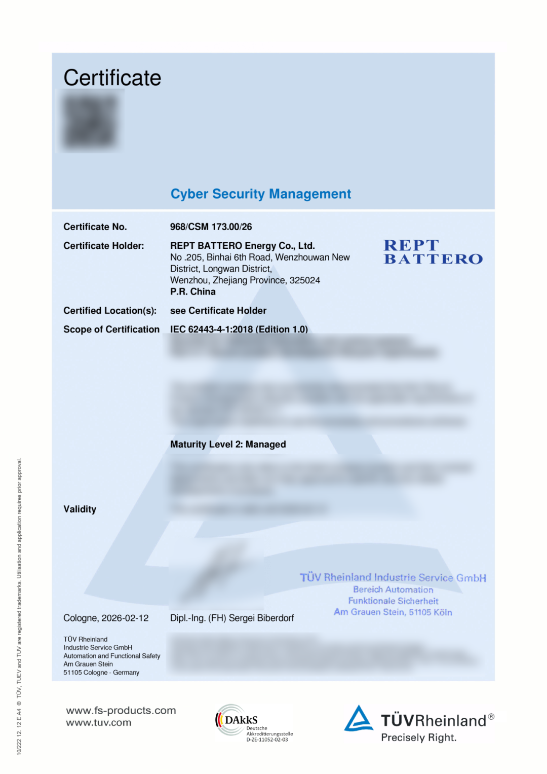 3月16日,瑞浦兰钧获得国际独立第三方检测、检验和认证机构德国莱茵TÜV集团(以下简称“TÜV莱茵”)颁发的IEC 62443-4-1网络安全管理体系认证证书。TÜV莱茵大中华区工业服务与信息安全副总裁孙国荣先生为瑞浦兰钧颁发了证书,瑞浦兰钧BMS技术总监沈成宇先生代表公司接受了证书。