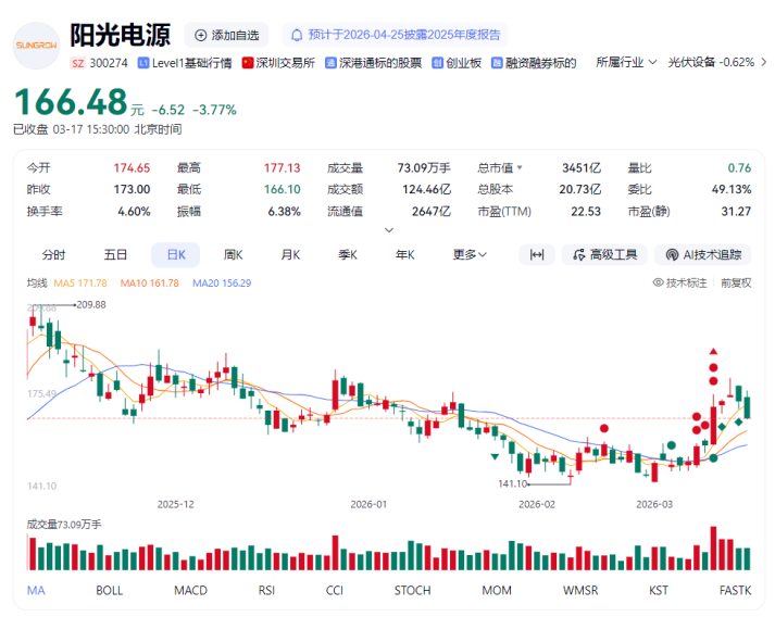 作为行业龙头,宁德时代和阳光电源的表现更是可圈可点。宁德时代凭借储能电芯的绝对优势,全球市占率超过36%,2025年储能营收达624亿元,毛利率显著高于动力电池业务,公司更是明确计划3年内将储能业务占比提升至50%。而阳光电源则受益于大储与PCS业务的高增长,叠加容量电价政策红利,项目收益率大幅提升,3月单周涨幅曾达17.08%,成为板块上涨的核心推手。