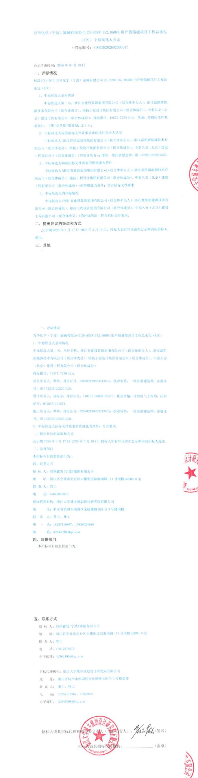 3月16日,万华化学(宁波)氯碱有限公司20.95MW/152.06MWh用户侧储能项目工程总承包(EPC)中标候选人公示。