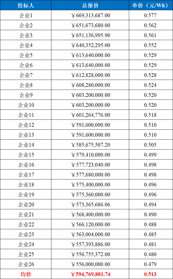 从来表情况来看,共26家企业参与投标,投标单价为0.479~0.577元/Wh,均价0.513元/Wh。具体开标情况如下: