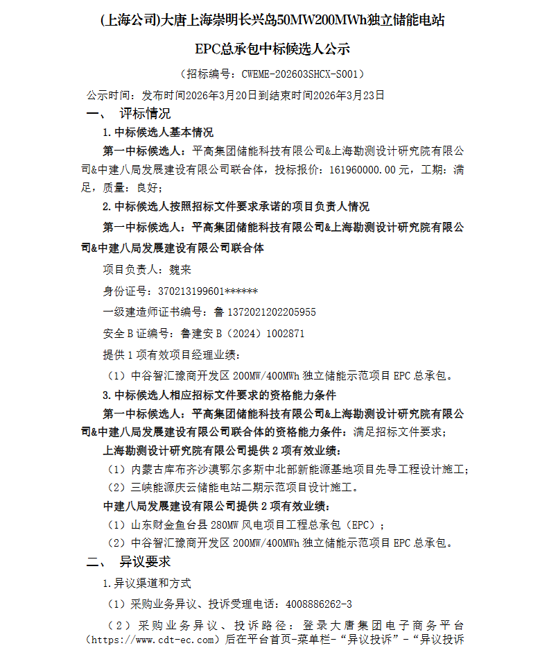 3月20日,大唐上海崇明长兴岛50MW200MWh独立储能电站EPC总承包中标候选人公示。公示显示,平高储能&上海勘测设计院&中建八局联合体以投标报价16196万元为第一中标候选人预中标。