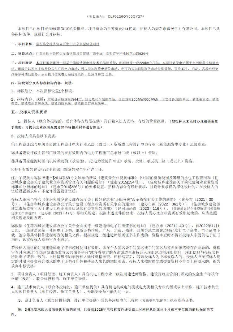 3月20日,崇左临空经济协同区集中共享新型储能项目公开招标公告发布。