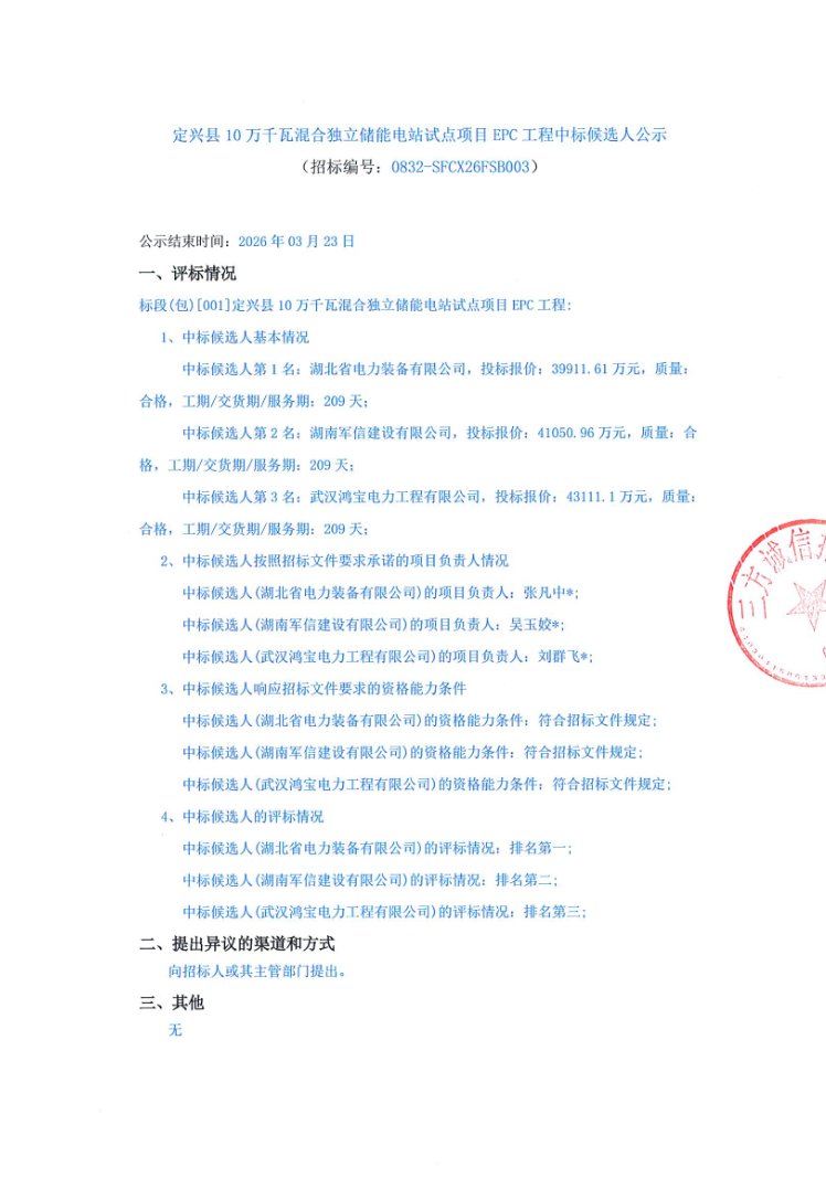 3月20日,定兴县10万千瓦混合独立储能电站试点项目EPC工程中标候选人公示。