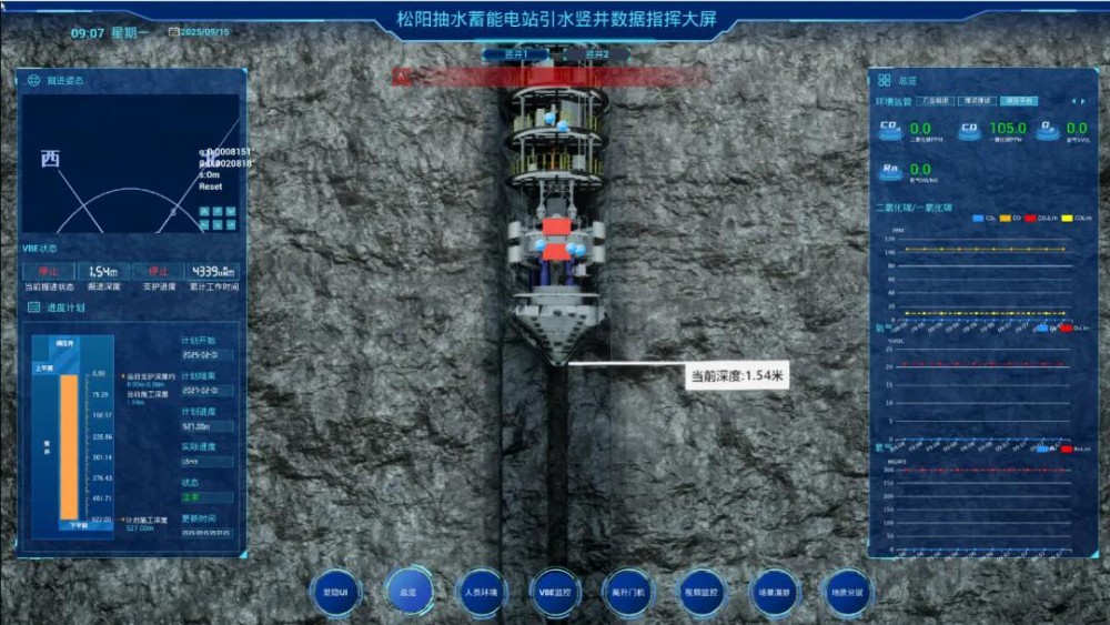 “天工号” 竖井掘进机,搭载了自主研发的数字孪生平台作为“智慧大脑”,深度融合掘、排、锚、喷全工艺链,实现全流程自主决策与精准协同。搭载上百个高精度传感器,依托5G通信实时回传数据至智慧管控大屏,对井下环境、设备运行和人员状态实现全景在线监测。进一步提升工序匹配度、施工精度与作业效率,从源头保障超深竖井施工安全、质量和进度。