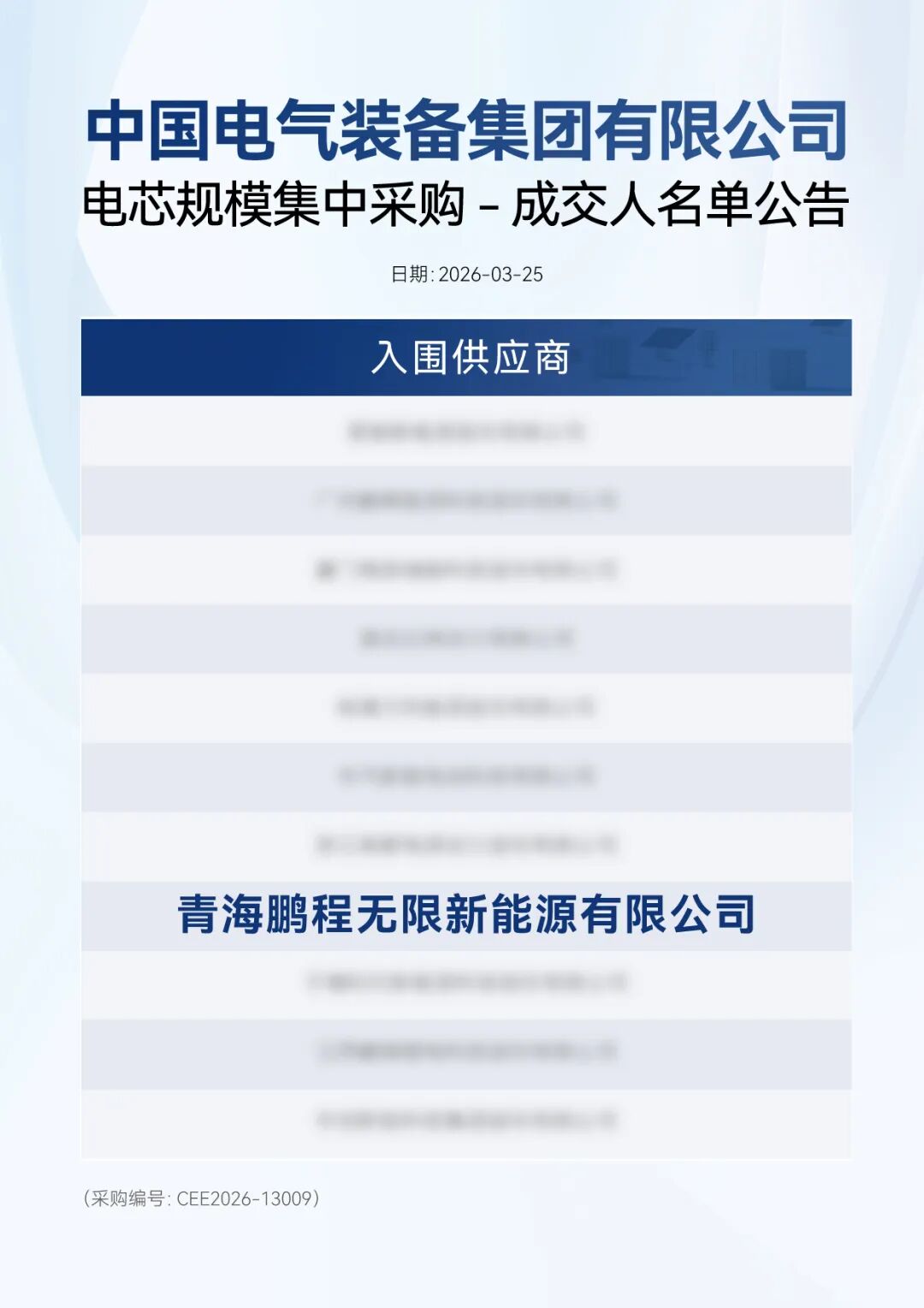 近日,中国电气装备集团储能电芯规模集中采购项目结果正式公布,鹏程无限凭借领先的电芯技术、稳定的规模化交付能力与严苛的品控体系,成功入围电芯集采供应商名单,成为央国企大型储能集采的核心合作伙伴。此次入围,既是中国电气装备对鹏程无限产品与服务的高度认可,也标志着双方在新型电力系统与储能产业协同发展上迈出关键一步。