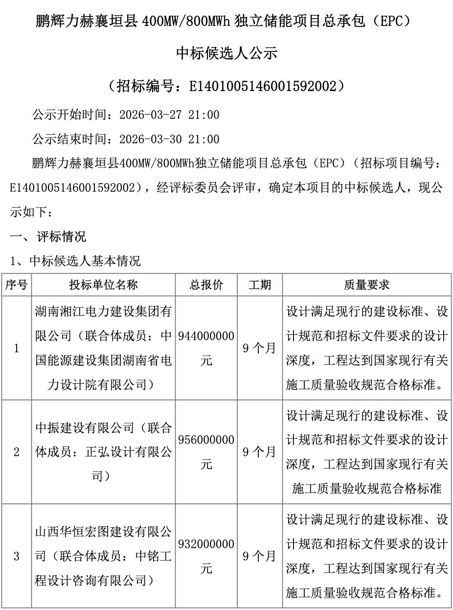 3月27日,鹏辉力赫襄垣县400MW/800MWh独立储能项目总承包EPC中标候选人公示。