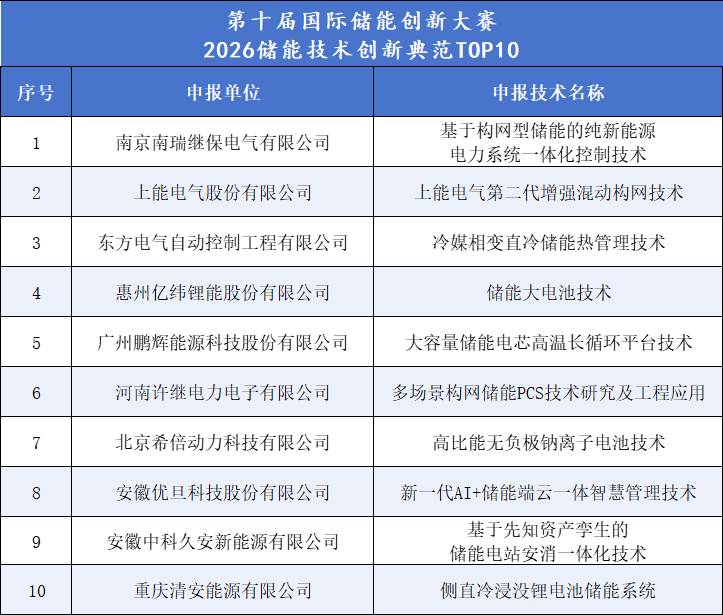 2026储能技术创新典范TOP10