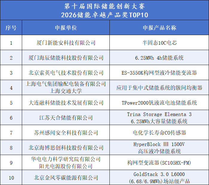 2026储能卓越产品奖TOP10