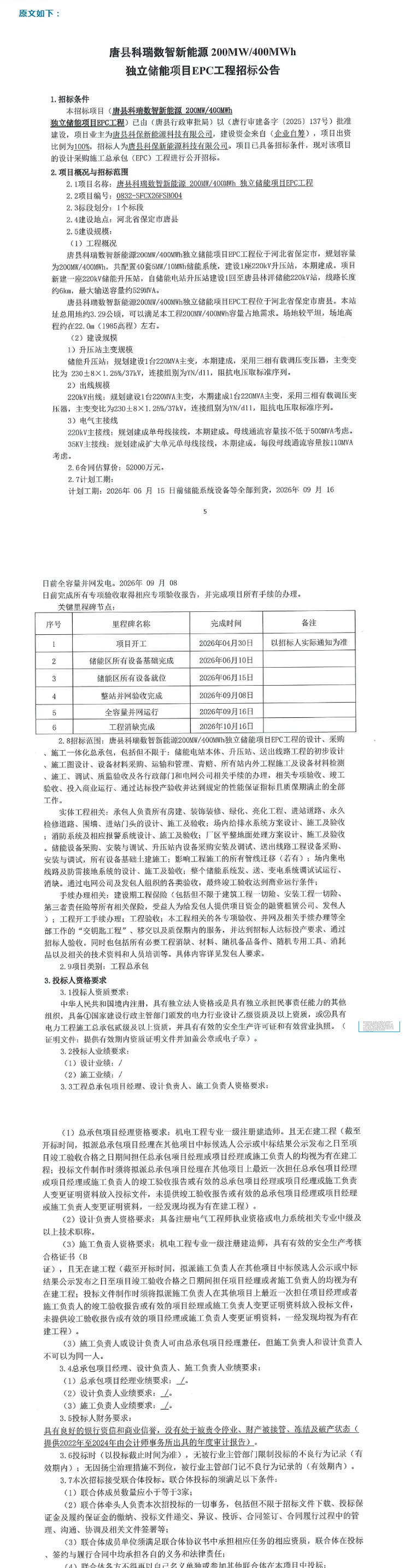 近日,河北唐县科瑞数智新能源200MW/400MWh独立储能项目EPC工程发布招标公告,项目资金来源为自筹资金52000万元,合单价1.3元/Wh,招标人为唐县科保新能源科技有限公司。