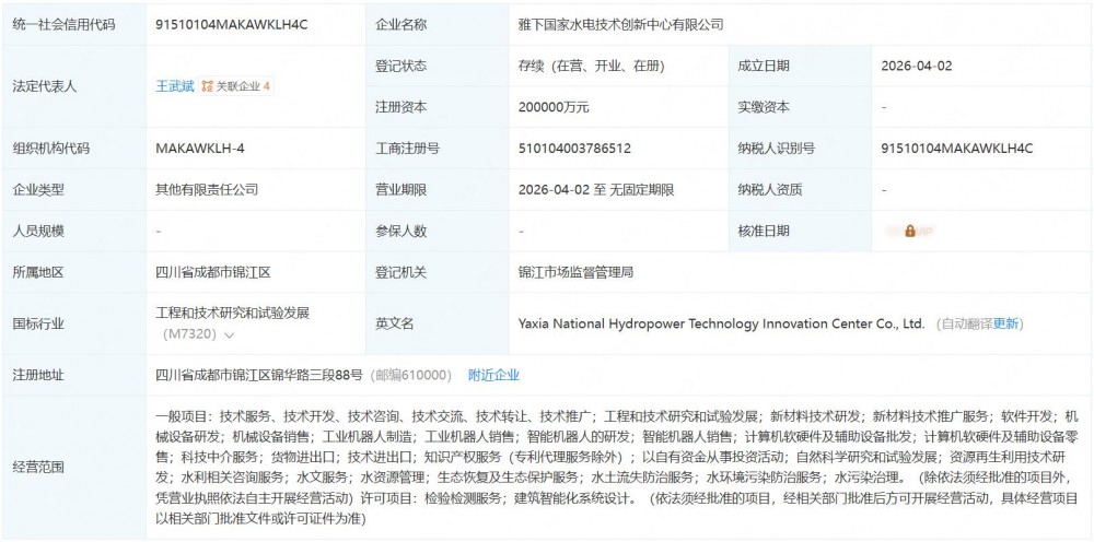 4月2日,雅下国家水电技术创新中心有限公司成立,注册资本200,000万元。