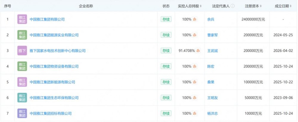 4月2日,雅下国家水电技术创新中心有限公司成立,注册资本200,000万元。股东信息显示,该公司由中国雅江集团有限公司控股,参股单位包括中国电力建设集团有限公司、中国能源建设集团有限公司、中国电气装备集团有限公司、中国水利水电科学研究院、中国地震局地质研究所、哈尔滨电机厂有限责任公司、东方电气集团东方电机有限公司、清华大学资产管理有限公司。截止目前,中国雅江集团旗下已经有6家新公司。