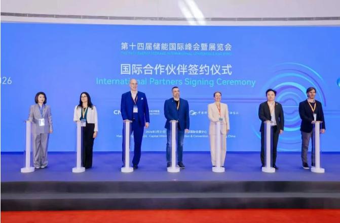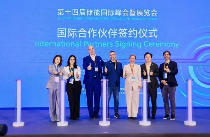 ESIE国际合作伙伴签约由ESIE主办方代表中关村储能产业技术联盟副理事长兼秘书长刘为与加州储能联盟董事Diana Gallegos、欧洲储能联盟秘书长Patrick Clerens、加拿大储能联盟主席兼首席执行官Justin Rangooni、长时储能理事会首席执行官Julia Souder、澳大利亚新能源协会秘书长茆云龙,以及西班牙储能技术平台代表、电池与应用化学领域负责人(ITE)Mayte Gil六家国际权威机构共同完成。