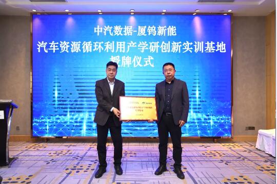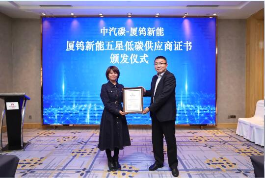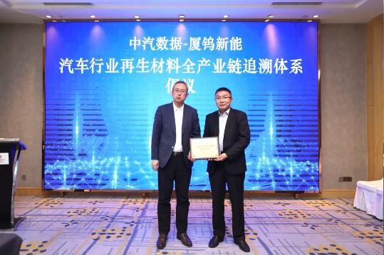 会上,中汽数据总经理冯屹向厦钨新能授予“汽车资源循环利用产学研创新实训基地”牌匾,赣州豪鹏总经理林昀上台接收。中汽数据总工程师张鹏向厦钨新能颁发“汽车行业再生材料全产业链追溯体系倡议参与单位”证书,厦钨新能供应链管理部经理庄勋如上台领取证书,并正式启动了双方共同推进的动力电池再生材料全链追溯示范项目。此外,中汽碳总经理助理石红为厦钨新能颁发“五星低碳供应商”证书,庄勋如代表公司领取。
