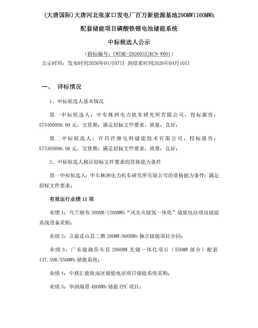近日,大唐河北张家口发电厂百万新能源基地290MW1160MWh配套储能项目磷酸铁锂电池储能系统采购中标候选人公示。具体中标候选情况见下: