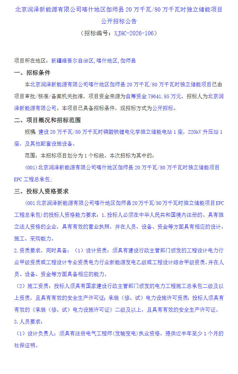 2026年4月14日,北京润泽新能源有限公司新疆喀什地区伽师县200MW/800MWh独立储能项目EPC发布招标公告,项目资金来源为自筹资金79641.95万元,合单价0.996元/Wh。招标人为北京润泽新能源有限公司。