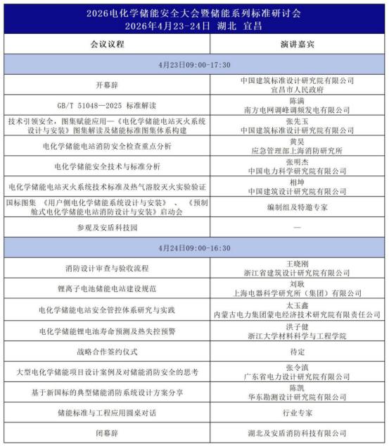 4月23日至24日,2026电化学储能安全大会暨储能系列标准研讨会将在湖北省宜昌市隆重举行,会议议程抢先看!
