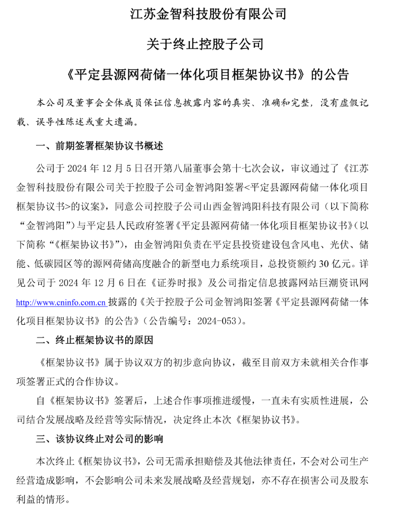2026年4月17日,上市公司金智科技发布公告,正式终止其控股子公司山西金智鸿阳科技有限公司与平定县人民政府签订的《平定县源网荷储一体化项目框架协议书》。