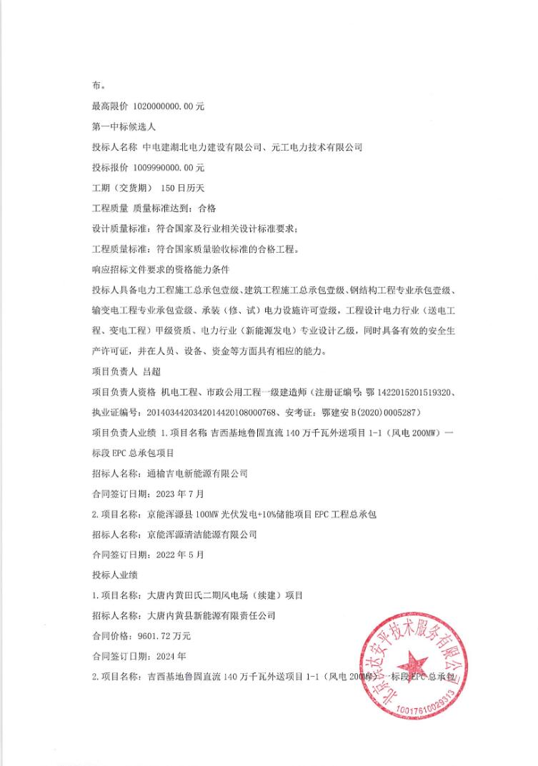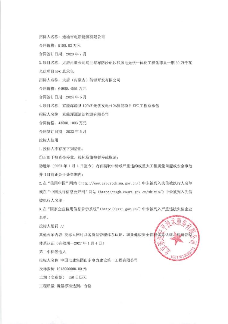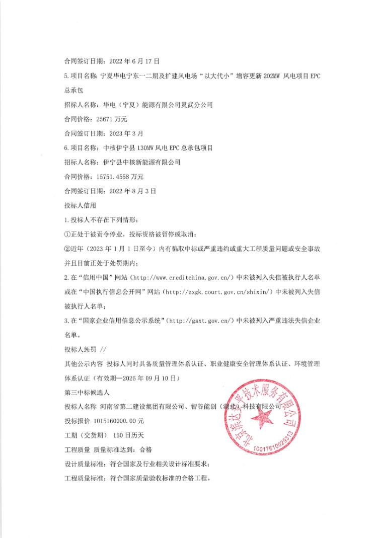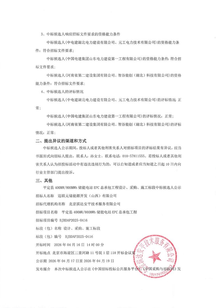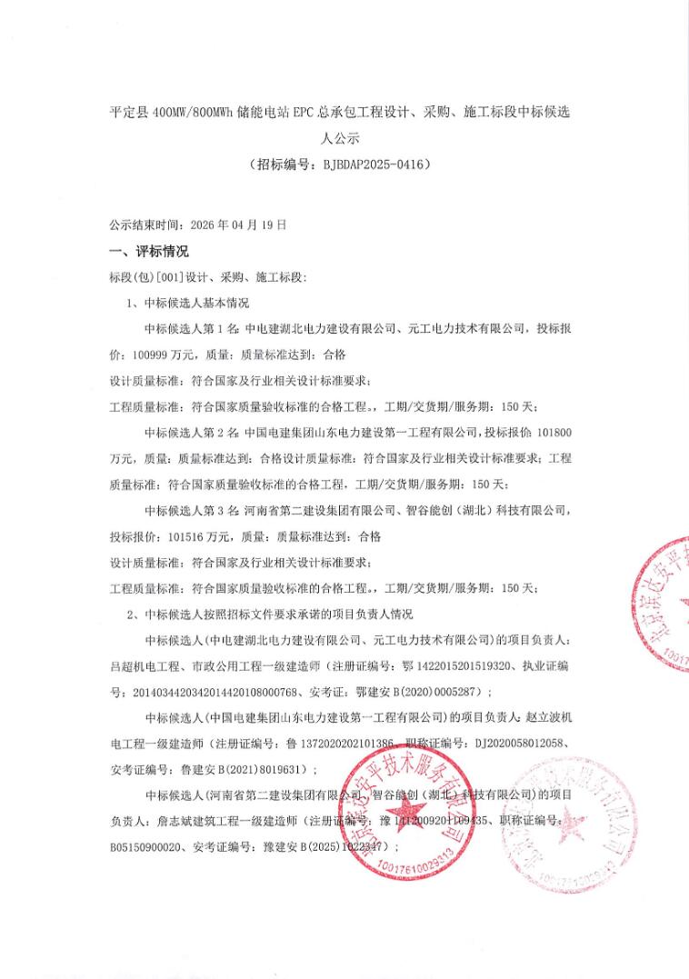 第一中标候选人为中电建湖北电力建设有限公司、元工电力技术有限公司,投标报价为100999万元,折合单价1.2625元/Wh;第二中标候选人为中国电建集团山东电力建设第一工程有限公司,投标报价为101800万元,折合单价1.2725元/Wh;第三中标候选人为河南省第二建设集团有限公司、智谷能创(湖北)科技有限公司,投标报价为101516万元,折合单价1.269元/Wh。