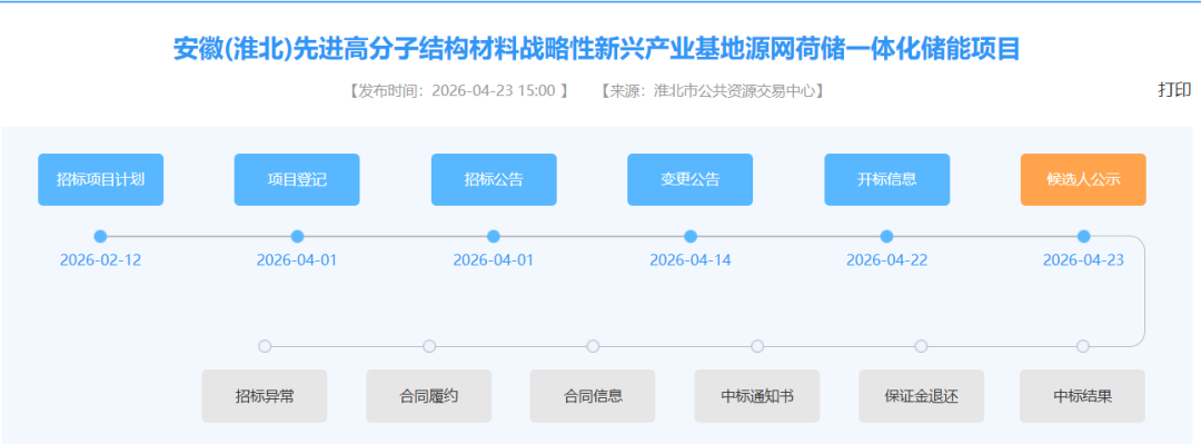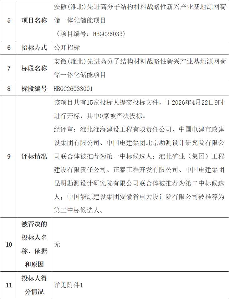 2026年4月23日,安徽(淮北)先进高分子结构材料战略性新兴产业基地源网荷储一体化储能项目开标并公示中标候选人。15家企业投标,13家为国有企业,公示的中标候选人,建安工程费报价单价约为1.2488-1.3854元/Wh。