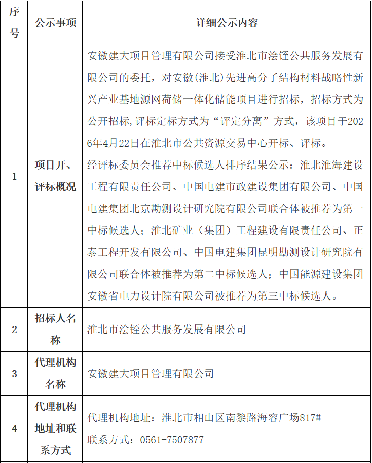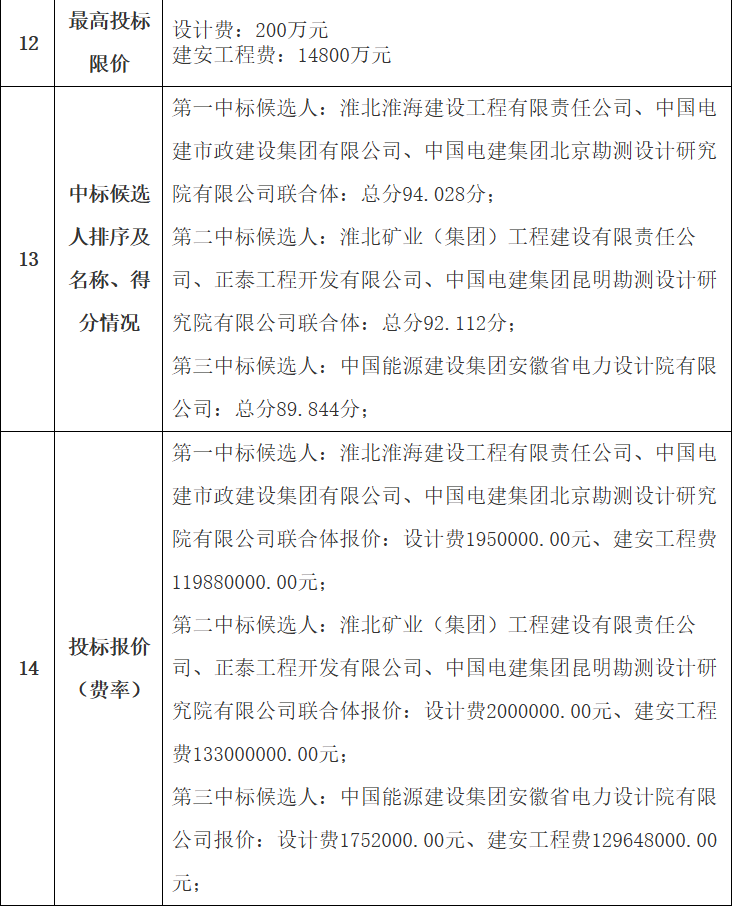 其中,第1中标候选人为淮北淮海建设工程有限责任公司、中国电建市政建设集团有限公司、中国电建集团北京勘测设计研究院有限公司联合体,投标报价,设计费195万元,建安工程费11988万元(折合单价约1.2488元/Wh)。