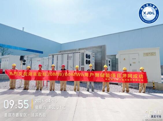 4月25日,湘江电力集团承建的湖南宏旺新材料 30MW/60MWh 电化学储能项目成功并网送电。